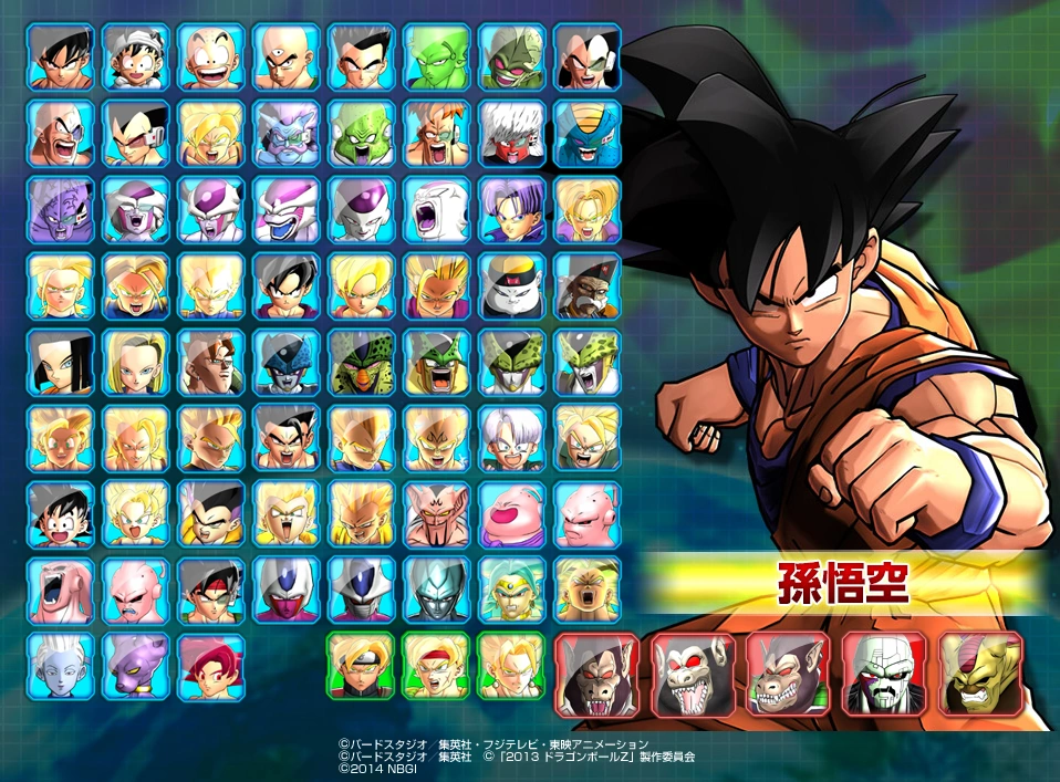 - Goku (Base, Superguerrer, Superguerrer de Fase 2, Superguerrer de Fase 3, Superguerrer Déu)