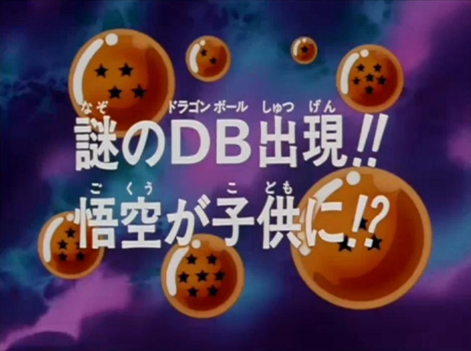 Aparició d'unes misterioses boles de drac. En Son Goku s'ha fet petit (謎のDB出現!!悟空が子供に!?, Nazo no Doragon Booru Shutsugen!! Gokū ga Kodomo ni!?) és l'episodi 1 de Bola de Drac ![]()