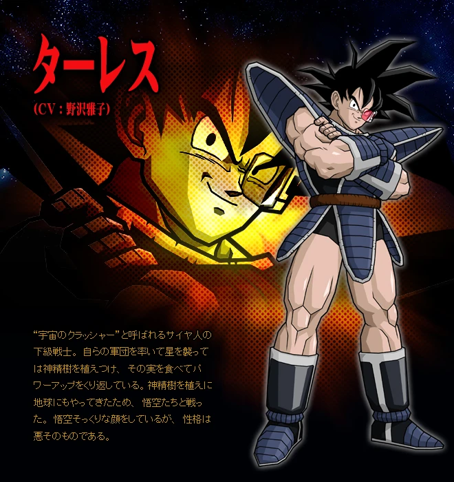 | Saiyans de sang pura | Bardock/Bardock del Futur • Bio-Broly • Borgos • Broly/Broly del Futur • Cabba • Fasha • Gine • Goku/Goku del Futur • Rei Vegeta • Nappa/Nappa del Futur • Onio • Superguerrer Original • Superguerrer Déu Original • Paragus • Raditz • Scarface • Shorty • Shugesh • Tarble • Tora • Turles • Vegeta/Vegeta del Futur • Zorn |