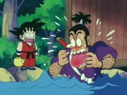 Entonces, el ninja le pide a Goku cerrar los ojos y contar hasta treinta mientras se esconde, el inocente niño le hace caso pero cuando iba por el número dieciocho se queda estancado, así que abre los ojos y ve que el Ninja se esconde debajo de una roca hueca y este lo regaña, así que le dice que reinicie el conteo, éste esta vez si cuenta hasta treinta y apenas terminó se va a buscar a Murasaki a quien no encuentra. Él entra a una casa, y mira debajo de una tabla donde solo ve una gran cantidad de revistas sucias. A continuación sale de la casa porque escucha unos ruidos, al salir ve una pipa bajo un lago donde estaba el ninja escondido, de repente una rana salta sobre la cara Murasaki y este empieza a moverse, y Goku empieza a sospechar que el ninja esta en el agua, el niño vuelve a entrar para buscar una tetera con agua hirviendo, toma la tetera y la vierte abajo de la pipa, así que el ninja sale y le grita a Goku que le quemó la lengua.