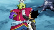 En un oscuro lugar remoto, otro misterioso hombre llamado Hearts observa la batalla en curso y dice que no había anticipado lidiar con los del Universo 7 ahora mismo. Justo en ese momento, Zamas Pothala emerge desde las sombras y manifiesta su animadversión por los humanos pero Hearts le aconseja que tenga paciencia ya que deben esperar hasta que el Rey de Todo haya sido derrotado. De vuelta en el campo de batalla, Vegeta y Trunks logran hacerle frente a Kamin y Oran. Kamin está contenta de que ellos dos podrán hacer el combate más divertido y Oran está de acuerdo al afirmar que las cosas se están poniendo interesantes. Él le dice a su hermana que llego la hora de hacerlo y se preparan para luchar otra vez. Esto despierta la inquietud en Vegeta y se pregunta que es lo que están pensando hacer.