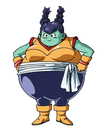 Es de contextura gorda, su piel es verde, el cabello es azul y lleva dos coletas. Tiene una camiseta amarilla con lineas rojas y guantes del mismo color.