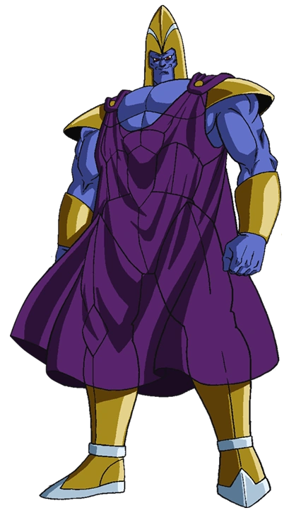 Es un hombre humanoide de muy alta estatura, es robusto, y bastante musculoso. Su piel es de color lavanda, y sus ojos son rojos. Porta una armadura dorada que cubre su cabeza, hombros y brazos. Viste una especie de quitón púrpura que usa para cubrir parte de su torso.