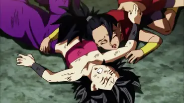 Kale rushed to her side, trying to help her up, but Frost quickly moved in and delivered a powerful punch to Kale's gut, knocking her back and unable to stand up. Caulifla, seeing her friend hurt, felt a rage unlike any she had ever felt before.