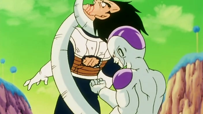 Il abat dans un premier temps Krilin qu'il empale et en joue même dans l'animé. Il est étonnamment mis en déroute par Son Gohan, furieux. Cependant vient le second round et c'est Son Gohan qui, à son tour, est mis en danger. Krilin intervient cependant une fois guérit par Dendé et coupe la queue de Freezer par la même occasion.