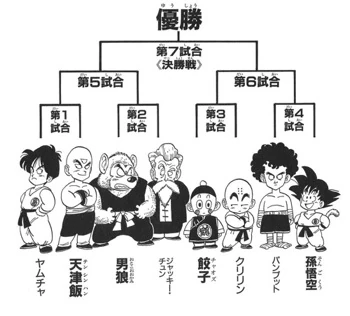 - A travers cela, se présente Ten Shin Han et Chaozu que devront affronter Gokû, Krilin et Yamcha. A noter qu'il y a un décalage dans l'anime, puisque Gokû à croisé la route de Ten Shin Han et Chaozu dans l'épisode 82. Ces derniers se servaient abusivement de l'animal Inoshikachô pour monter quelques supercheries de village en village. L'autre élément majeur dans l'anime, c'est la présence de Nam lors des éliminatoires. Sa défaite face à Ten Shin Han provoquera quelques incohérences avec la saga Piccolo, puisque Nam est supposé se faire tuer par Tambourine. Parmi les trois tournois de Dragon Ball, il s'agit du plus court, et de la finale la plus rapide.