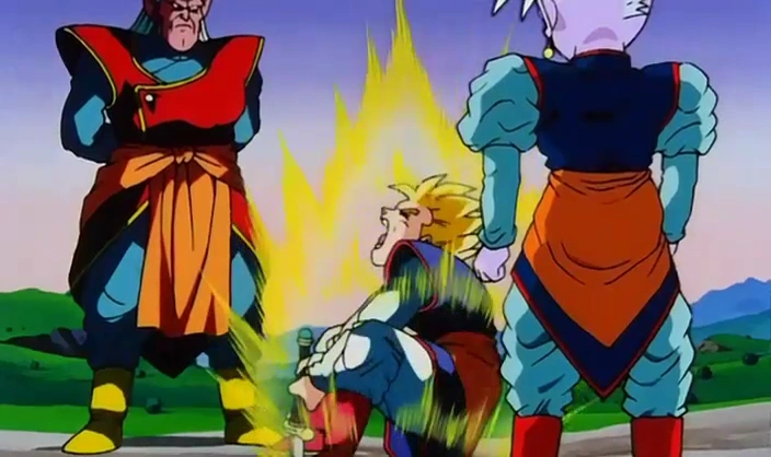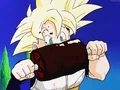 Il se transforme en Super Saiyan, il parvient d'un coup de pied à écarté la menace que représente Tagoma, mais il est mortellement blessé par Freezer.