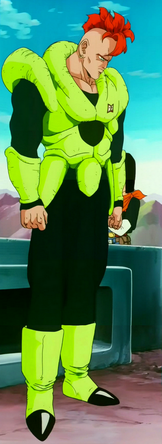 Androide 16 è stato il penultimo androide creato dal Dr. Gelo ad essere dotato esclusivamente di tecnologia sintetica. Il dottore lo definì un modello sperimentale, nonché il suo più grande fiasco e, temendo che fosse troppo pericoloso, decise di non attivarlo. Dal punto di vista di Gelo, il malfunzionamento più grave di 16 potrebbe essere stato il suo comportamento pacifico e il suo amore per la natura, caratteristiche che lo rendevano simile all'Androide 8, anche se comunque era deciso a portare a termine l'assassinio di Son Goku, per il quale era stato programmato. Numero 16 era stato costruito per assomigliare al figlio del dottor Gelo, che era rimasto ucciso da Goku quando aveva distrutto il Red Ribbon. Nelle varie linee temporali alternative, l'Androide 16 non è mai stato attivato per motivi sconosciuti e questo è confermato dal fatto che Trunks del Futuro non lo riconosce. Nella linea temporale principale, fu attivato dall'Androide 18. Dopodiché, Trunks cercò di distruggerlo con il Cannone Distruttore prima che del suo risveglio, ma i due androidi gemelli e la capsula dove era contenuto 16 non furono minimamente scalfiti. Dopo la sua attivazione, 16 seguì 17 e 18 nel loro viaggio alla ricerca di Goku.