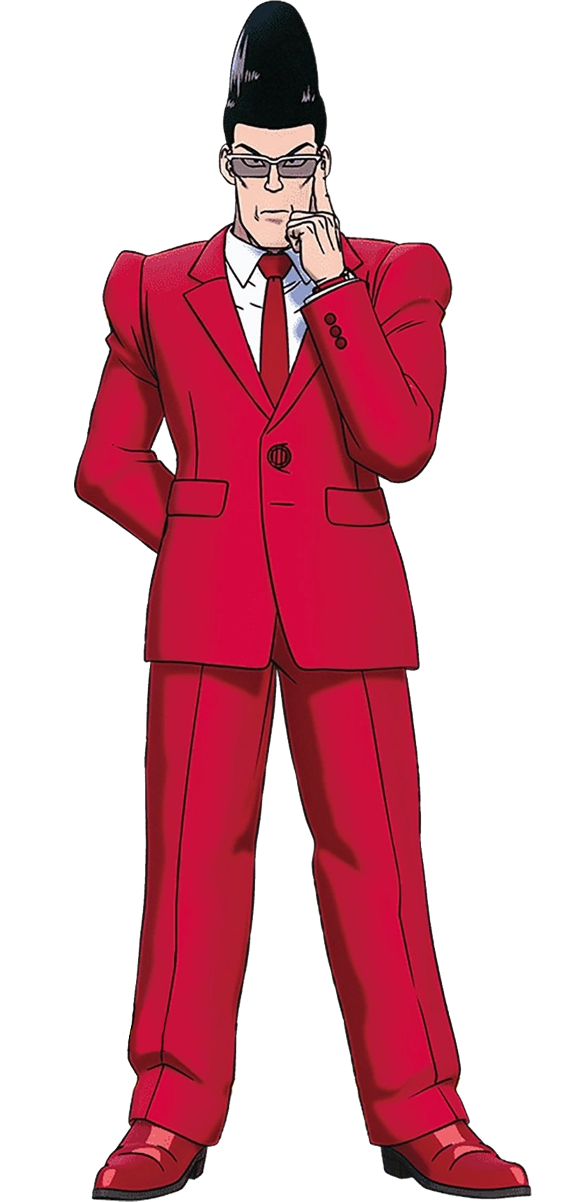 È molto alto ed è caratterizzato dalla sua grande capigliatura. Porta gli occhiali ed è vestito di rosso. Porta anche un ombrello rosso con il logo del Red Ribbon Army.