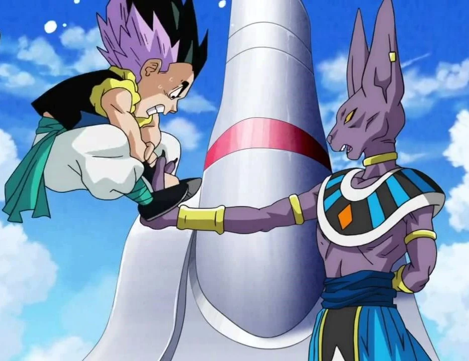 Goten e Trunks si fondono per cercare di fermare l'ira di Beerus, infuriato dopo l'affronto di Majin Bu. Gotenks dice a Beerus che è assurdo prendersela per del budino ma il Dio della Distruzione lo schiaffeggia sul braccio provocandogli un forte dolore.