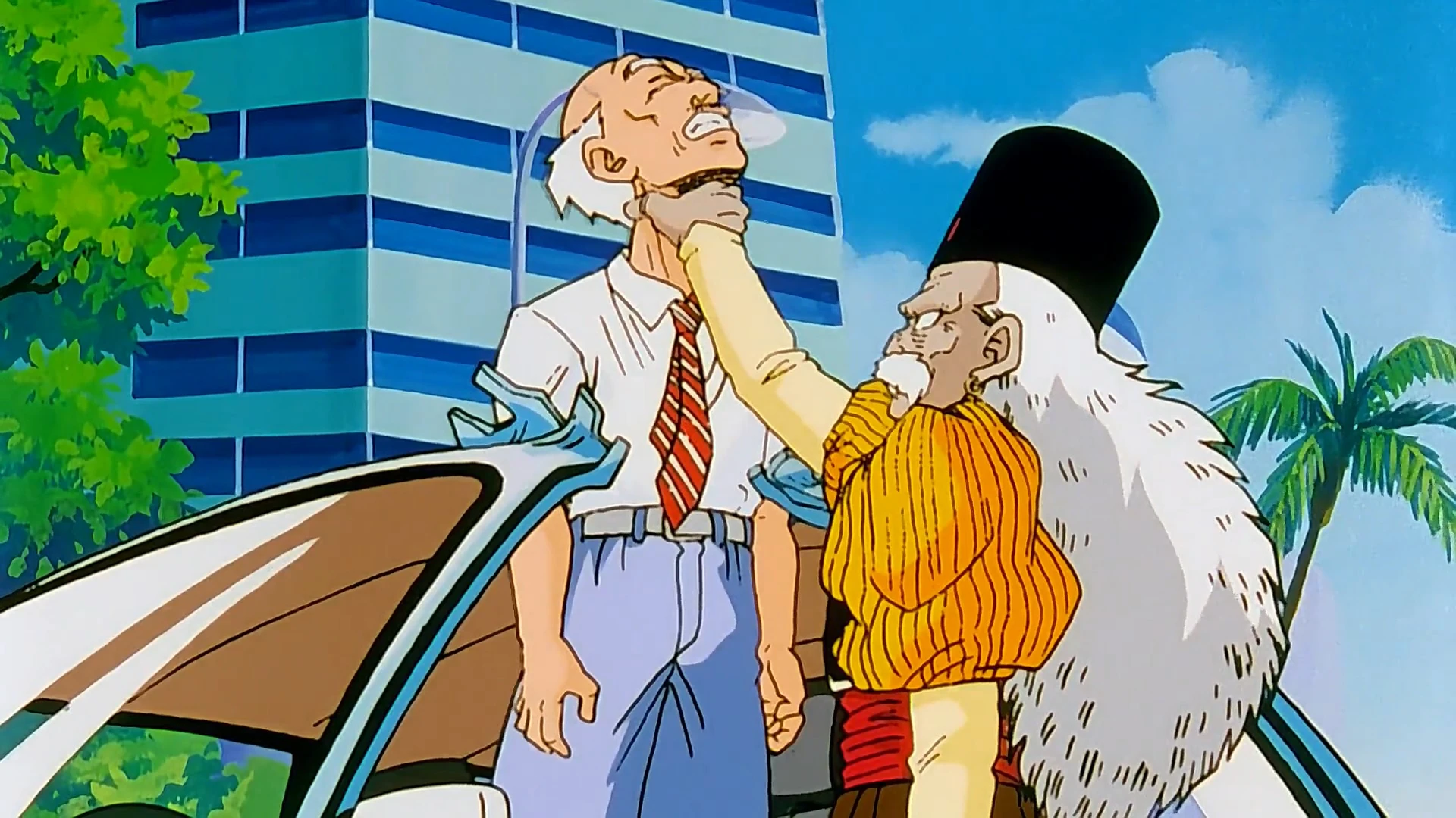 In un altro posto della città Yamcha sta correndo per cercare di trovare gli androidi. Poco distante da lui due signori stanno discutendo della macchina volante che esplosa e chiedono a due passanti se hanno visto anche loro quello che è successo. I due li guardano con aria minacciosa. Uno dei due si avvicina e colpisce i due uomini, uccidendoli al primo colpo. L'altro, che ha l'aspetto di un anziano, è in mezzo alla strada e una macchina sta suonando il clacson per avvisarlo di togliersi di mezzo. L'anziano sconosciuto decide di sistemare il signore al volante e con una mano buca il cofano dell'auto togliendogli il motore e gettandolo a terra; poi prende l'uomo per il collo e lo strangola fino a farlo morire. Una ragazza vede la scena ed urla. L'urlo viene sentito da Yamcha che corre verso di loro. L'anziano rileva che si sta avvicinando a loro un uomo con un energia potentissima e pensa che il sistema sia guasto. Il compagno, che lo chiama Numero 20, gli dice che il suo sistema non è guasto perché anche lui lo rileva; questo pensa che si tratti di Son Goku dato che non è un umano normale.