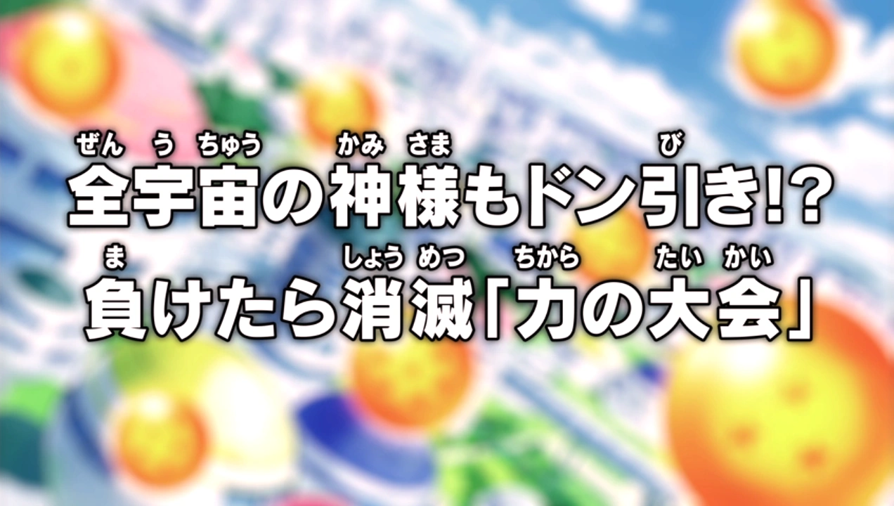 Bogowie z każdego wszechświata w szoku!? Przegrani będą zlikwidowani w Turnieju Mocy (jap. 全宇宙の神様もドン引き!? 負けたら消滅「力の大会」 [Zen uchū no kamisama mo don hiki!? Maketara shōmetsu `chikara no taikai'], ang. The Gods of Every Universe in Shock?! Losers Erased in the Tournament of Power) – "Turniej zostanie zorganizowany w świecie próżni." Tymi słowami Daishinkan odpowiada na pytanie Gokū odnośnie miejsca, w którym będzie się toczył turniej. Na pytanie Kaiōshina odnośnie wygranej, kapłan odpowiada, że nagrodą dla zwycięskiego uczestnika będą super smocze kule, a raczej życzenie, natomiast dla zwycięskiego wszechświata nic, bo jest to tajemnicą jak na razie, a przegrane wszechświaty zostaną zniszczone. Mówi do Sona, że ma godzinę na znalezienie trzech wojowników na mecz, pomiędzy ich, a Dziewiątym Wszechświatem. Kakarotto zastanawia się kogo by tu wybrać, reszta, dlaczego akurat ten wszechświat będzie walczył, a Beerus o nieodpowiedzialności Gokū.
