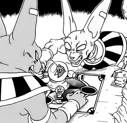 Beerus e Champa jogando o jogo de reencarnação