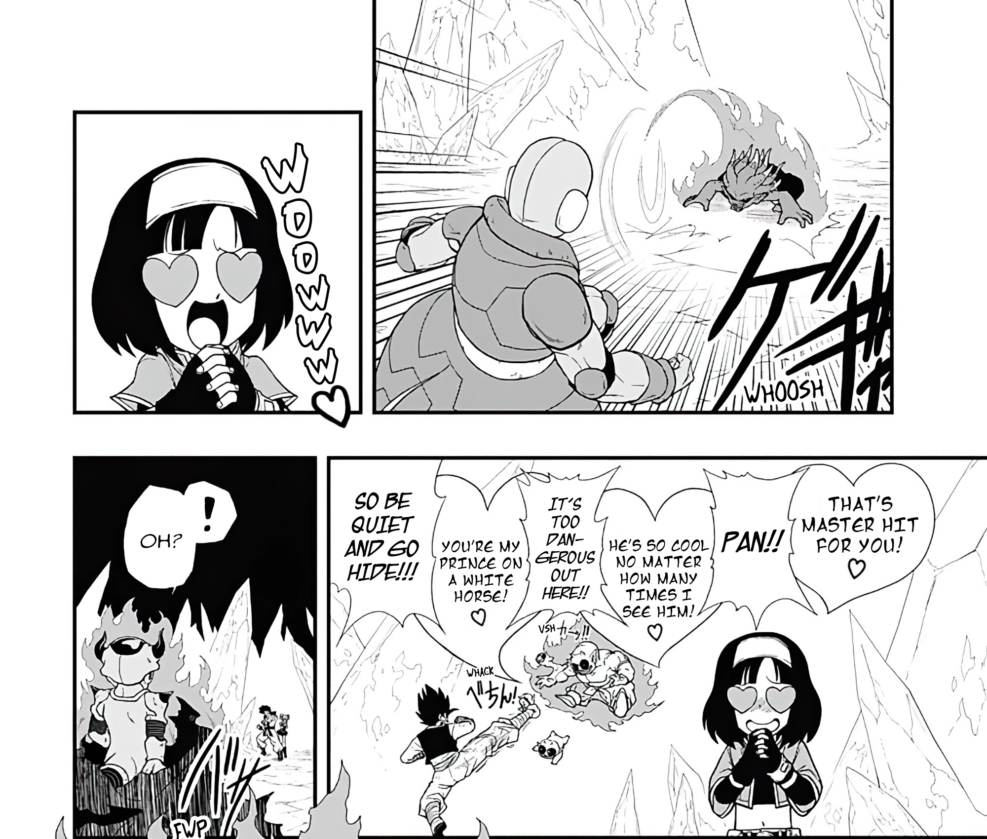 Gohan atravessa o portão negro, e logo descobre que Pan o seguiu. Ali eles encontram Shroom, que lança um ataque nela, mas ela é salva por Gohan. Gohan grita com Pan por atrapalhar a luta e ela sai voando e chorando. Ela logo retorna, e ataca Shroom nas costas, e dá palavras de coragem a seu pai que está perdendo a batalha. Shroom começa a voar até Pan, mas Gohan segura em sua roupa, transformado em Super Saiyajin 4, e agradece Pan antes de derrotar Shroom com um Kamehameha.