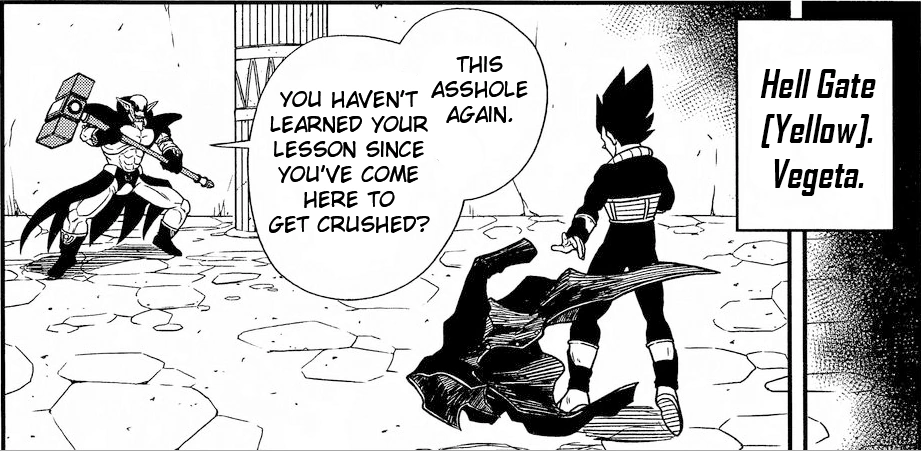 Gravy fica encarregado de defender a Hell Gate [Yellow]. Vegeta o enfrenta, dizendo que dessa vez não será derrotado pois sua energia está ao máximo. A luta não é vista no manga, mas Gravy perde a luta e o selo é removido.
