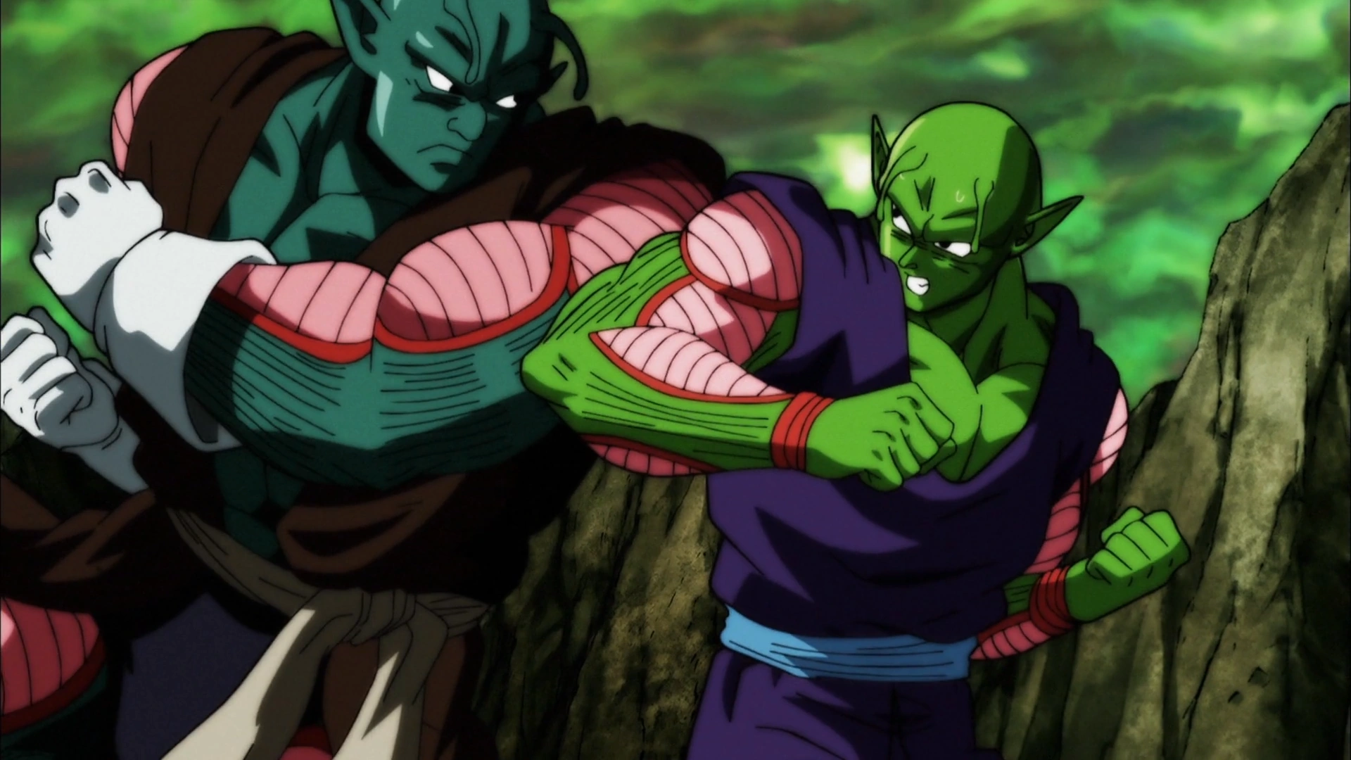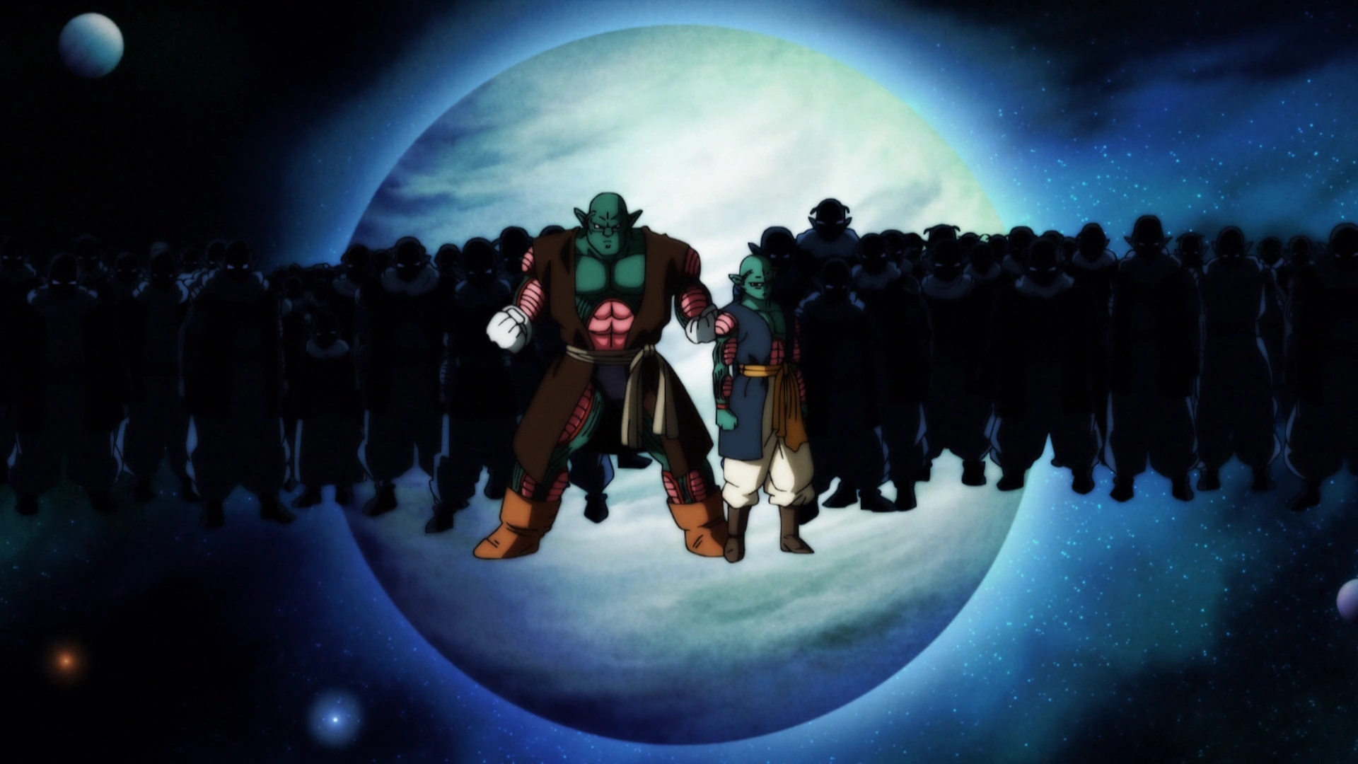 Enquanto Goku observa a luta entre Hit e Jiren, Saonel e Pilina tentam atacá-lo por trás, mas Gohan e Piccolo refletem seu ataque e os enfrentam.