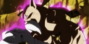 Indeed, Top has remained inside the arena, but he collapses and Frieza mocks him as trash that needs to be thrown away. Before Frieza can "gently" knock Top out of bounds though, Top gets back up on his feet, with his uniform in tatters and his bare chest exposed. Top declares that he no longer needs justice and has resolved himself. He begins emitting a gigantic ki very similar to a god's ki, and Belmod says it's time Top showed them "that" power. Top's eyes glow purple, he is veiled in a purple aura, and a crest appears on his chest (identical to the one Belmod wears on his clothing). Frieza is unimpressed by Top's transformation and tests him out by firing off a Golden Death Beam. However, the beam is completely nullified by Top's purple aura, and in the bleachers, Beerus recognizes this as the Power of Destruction, a power which only a God of Destruction is supposed to have. Khai points out that Top is the candidate to be Universe 11's next God of Destruction, and Belmod says now that Top's resolved himself, he is no different from a God of Destruction. Marcarita likewise tells Top it's time to show off the fruits of his training under her.