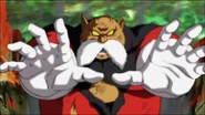 While the fight against Jiren rages on, Top and Android 17's battle continues as well, with 17 using his Android Barrier to block Top's Justice Flash. Seeing that only about six more minutes remain in the tournament, 17 starts blasting Top with an endless barrage of small ki blasts. Although these attacks don't have much effect on Top, they still keep him preoccupied, and in the bleachers 18 explains that 17 plans on using his infinite energy to stall Top like this until time runs out. Realizing 17's strategy, Top breaks away and vows to defeat him quickly to protect his universe, firing a tremendous ki beam towards 17, who counters with a beam of his own. The two beams struggle against each other, but before long Top's beam starts pushing 17 towards the edge of the arena. Before 17 can be pushed off, True Golden Frieza appears and blasts Top from behind. He thinks 17 has been playing around too much, and steps in to finish Top off himself. Frieza continues to fire at Top, who is still stuck in his beam struggle against 17 and unable to counterattack. Growing bored with his defenseless opponent, Frieza prepares a finishing blow, which damages Top so much that he finally loses the beam struggle and is enveloped by 17's blast. It looks as if Top has been defeated, but Whis sees that he has not materialized in the bleachers, meaning he's still in the game.