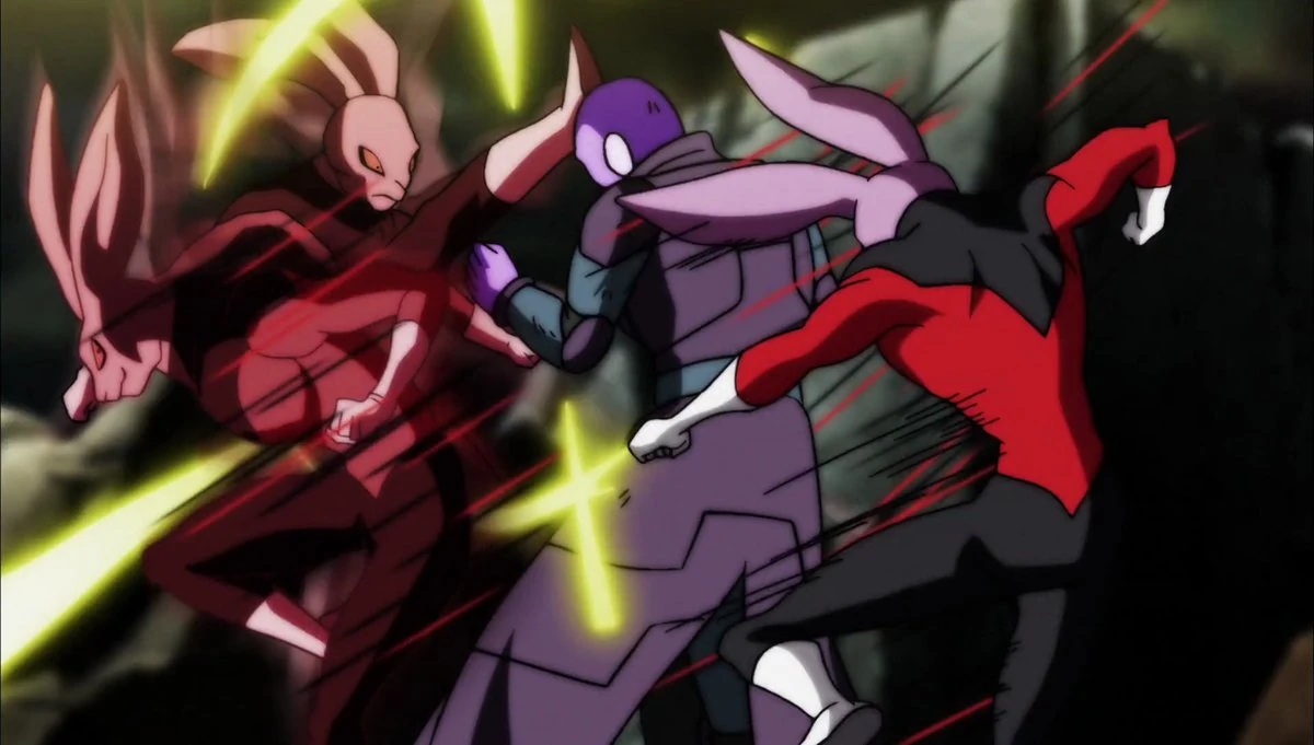Hit tells Goku to switch places with him, immediately attacking Dyspo. Hit lands a clean attack on Dyspo, explaining that he pretended to use Time-Skip by fooling Dyspo's ears with the same muscle tensing to counter Dyspo's attack. Goku turns Blue again and attacks K'nsi, ignoring his exploding whips, landing a clean blow. Hit lands another attack on Dyspo, gradually overwhelming him as he is forced to wonder if Hit is actually using Time-Skip or is pretending to. With Dyspo defeated by multiple Time-Skip attacks, Hit tells him to either jump off himself or Hit will throw him off. Dyspo refuses to surrender, and Hit picks him up and throws him, but he is once again saved by K'nsi's whips. K'nsi tells Dyspo to retreat as he prepares to take Hit with him and attacks but Hit Time-Skips behind him and knocks him off. With K'nsi knocked off, there are only three Pride Troopers remaining, but Khai does not worry as two of them are Top and Jiren.