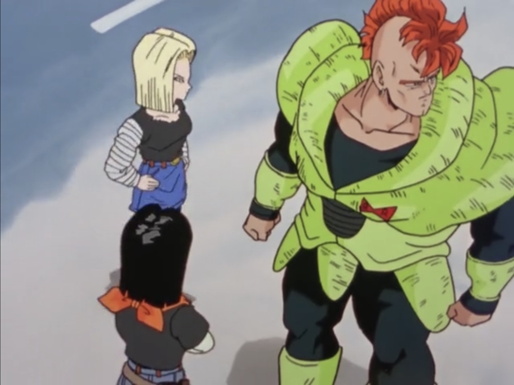 As the trio drives to Goku's home, 17 suddenly comes to a stop. He and 18 get out, feeling a sudden change in the atmosphere. 16 says that it came from the outskirts of West City. He then says that two organics with powerful ki are fighting. 17 says that he never told them he was equipped with a Power Radar, but 16 replies that he never asked. 17 asks who is fighting, but 16 says neither are in his databanks, although one of them rivals 17 in power. 17 says that his Power Radar is malfunctioning, as no one rivals him in power. The androids then decide to continue onwards, unaware that the combatants are Piccolo, who recently fused with Kami, and Cell, the ultimate creation of Dr. Gero created from the genes of the most powerful warriors to walk the Earth.
