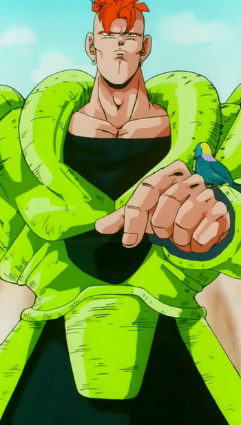 Despite his intimidating size, monotone dialogue, and seemingly dangerous appearance, Android 16 is calm, friendly, and embraces nature and humanity, aside from a cold and distant attitude towards Goku in particular, since he was initially programmed to eliminate him. He does not tolerate evil and described Cell as an existence whose purpose is to destroy life, especially nature and animals (as Cell is the true evil destroying android that posed a destructive intention to the Earth and its inhabitants of the present timeline, not himself, 17 and 18). He is also protective of whomever he considers his friends, and nature, as he tried to ask Android 17 or 18 to run and hide somewhere and not be absorbed by Cell, even fighting the imperfect bio-android, although these proved futile, as 17's cockiness got the better of him, causing his absorption, and his damaged body and Semi-Perfect Cell's power too much for him, leaving him unable to protect 18, also resulting in her own absorption, and these qualities proved him to be a valuable ally to the Z Fighters in their battle against Cell. He and his fellow android, 17, had a somewhat brother-like relationship. It is likely that 16's nature-loving character inspired 17 to become a park ranger himself after his resurrection, changing his demeanor to undergo a calm, mature, gentleman-like persona, who is willing to sacrifice himself to defend the surrounding animals from whosoever tries to harm them.