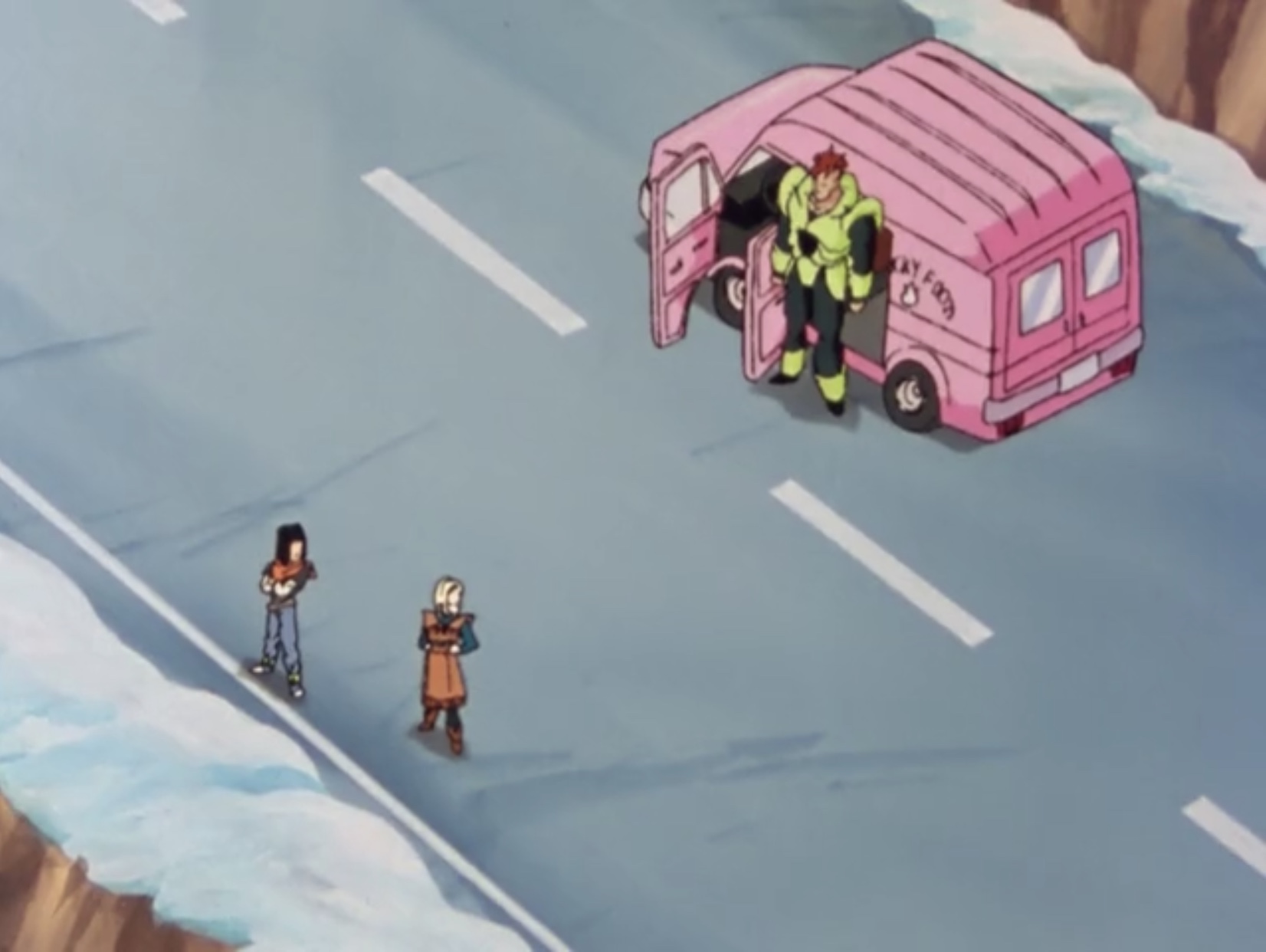 As they fly over a snowy area in the north, the androids spot a Lucky Foods van parked along the road next to a rest stop, while two employees are drinking coffee. When the trio inspect it, the employees notice and attempt to stop the Androids but are frightened when 16 lifts the van and dumps out its cargo. The androids then drive off, and 17 plans to head to Goku's House, but 18 reminds him that she wants new clothes and 17 agrees to take care of that first. As they drive, 18 asks 17 if he even knows where Goku's House is, and 17 replies that he doesn't and he has been guessing. 16 then chimes in with the house's coordinates and says they can be there within minutes if they fly. 18 agrees with flying there, but 17 says that small things in life are what make it fun.