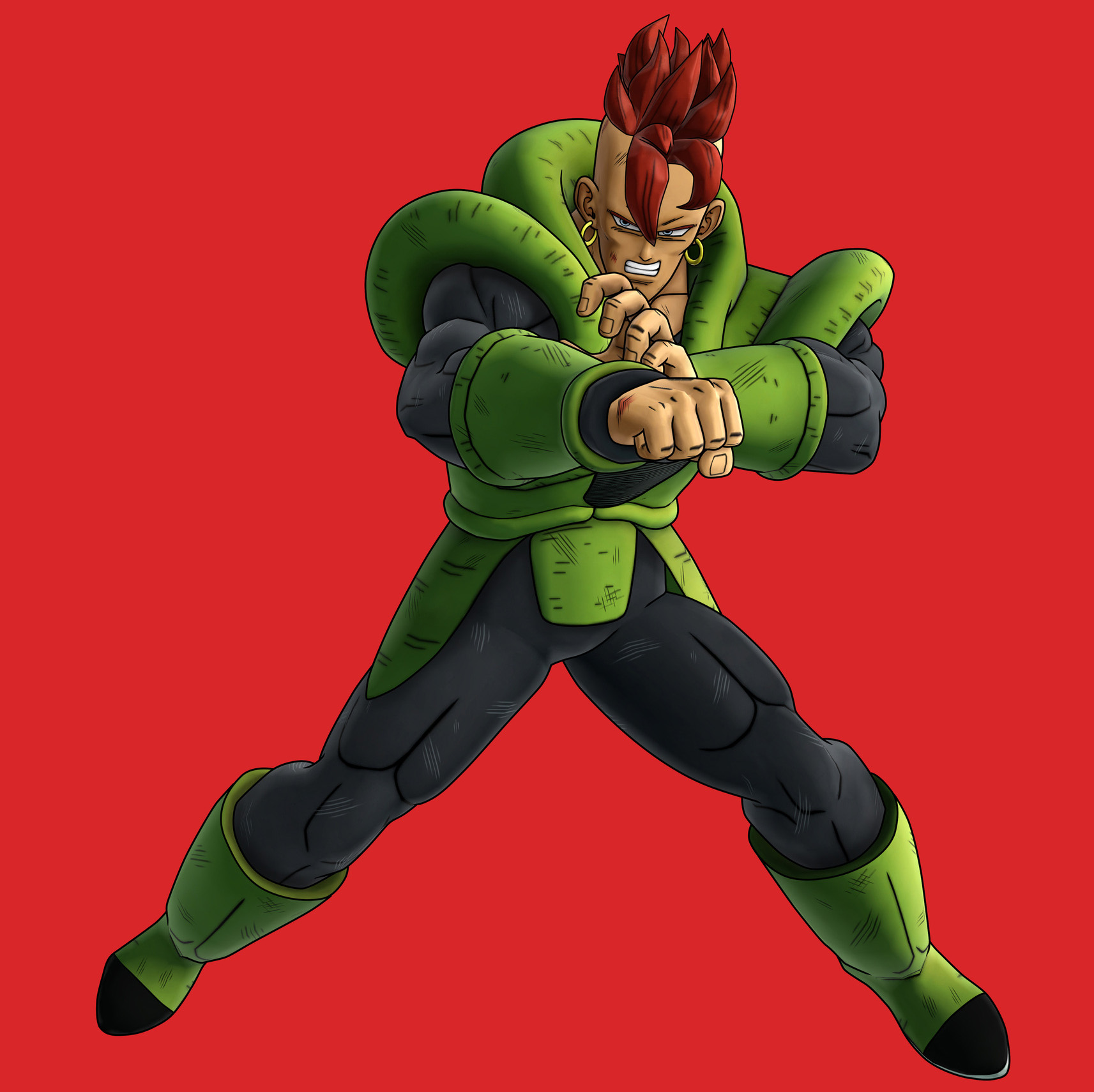 He has icy blue eyes, a red/orange mohawk, and gold hoop earrings. His clothing consists of a dark undersuit, with a lime green vest, boots, and bracers. A small Red Ribbon Army logo is sewn to the left side of his vest, indicating his creator's affiliation. This presumptively changes when 16 is taken to Dr. Brief to be repaired; the logo is patched by the Capsule Corp. logo after he joins the Z Fighters. His physical appearance is based on Dr. Gero's son Gevo.