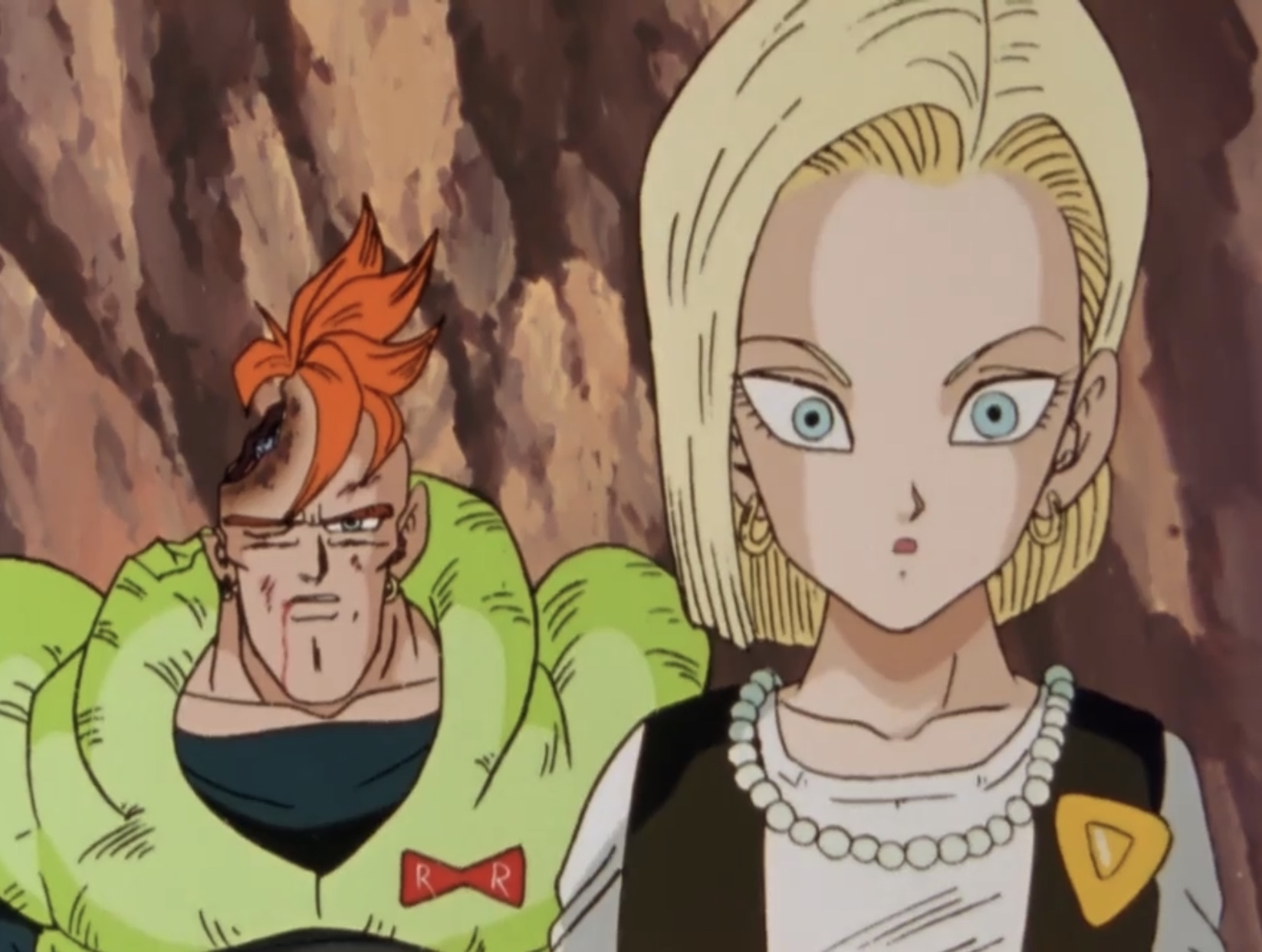 Android 16 takes flight still clutching Android 18, but Cell quickly overtakes them. Cell taunts Android 18 and Android 16, saying that they cannot escape from him, and that thanks to absorbing Android 17, he surprised even himself with his new speed. He wonders aloud how strong he has become, and a furious Android 16 throws a punch at Cell, who remains completely unfazed. Cell smiles at a shocked Android 16 and then blasts him in the head, disfiguring his head and leaving him in a critical condition.