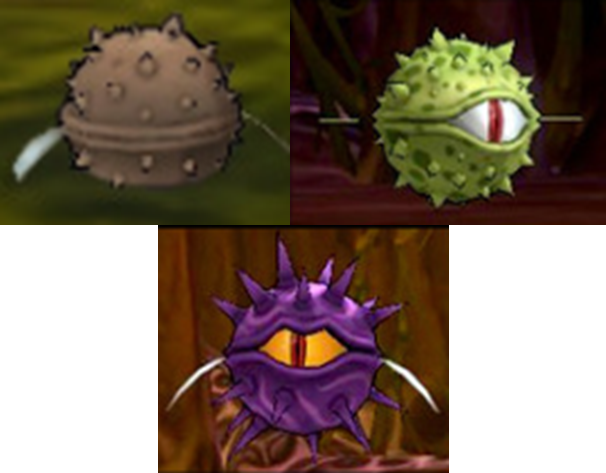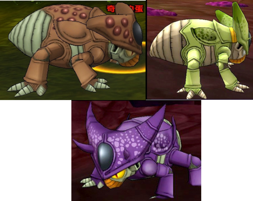 Peculiar Egg (brown), Half-Adult Cell Egg (green), Cell Egg in Evolution (purple)