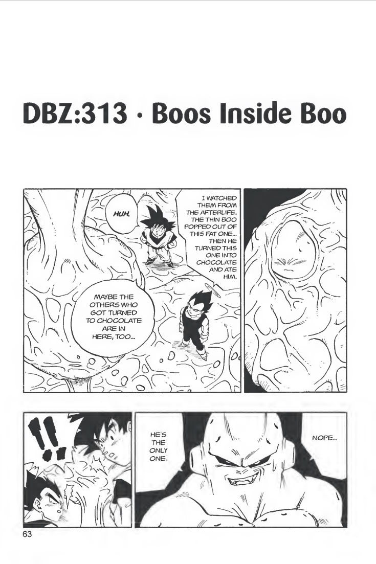 "Boos Inside Boo" (ブウの中のブウとブウ Bū no Naka no Bū to Bū, lit. "Boo and Boo Inside of Boo") is the three hundred thirteenth chapter of Dragon Ball Z and the five hundred seventh overall chapter of the Dragon Ball manga.