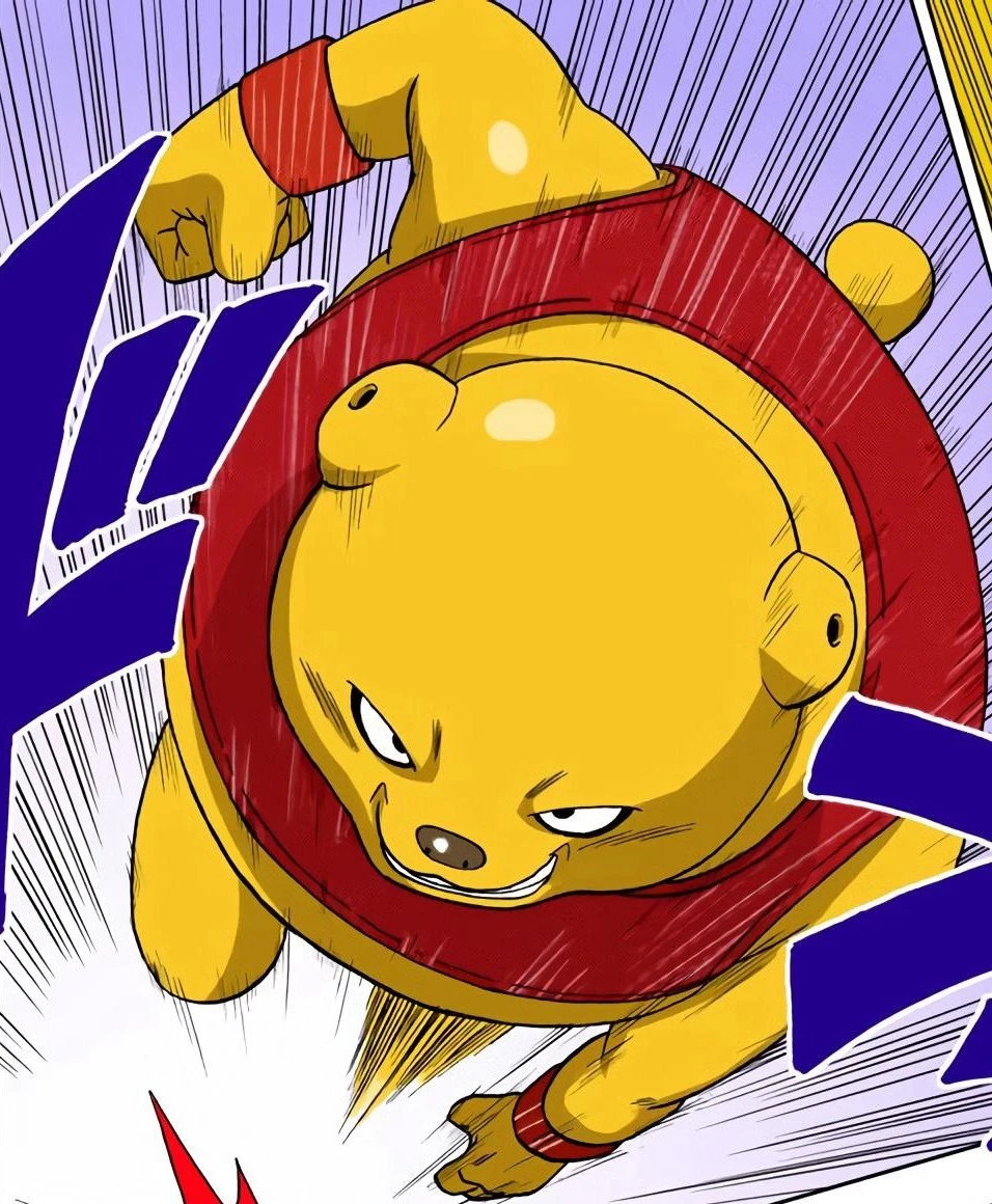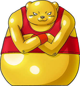 Botamo is a tall seemingly hairless humanoid ursine with a large build with his skin being fairly yellow and glossy. Despite being fat he is very fast and agile. He has a brown nose and a small yellow tail on the back. He wears a red tank top that covers his whole upper body, orange-red wristbands, and a pair of red boots. He has a rubber-like body composition and does not seem to have any bones at all, as Vegeta was literally able to tie his arms into a knot.