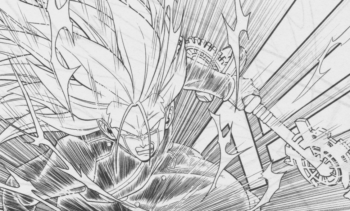 Super Saiyan 3 Xeno Trunks attacks Chronoa