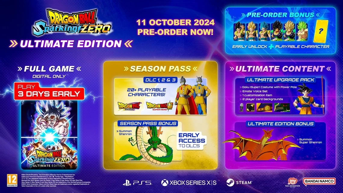 - The Season Pass for DLCs 1, 2, and 3, which will include 20+ characters from Dragon Ball Super: Super Hero and Dragon Ball Daima. Gohan (Super Hero), Piccolo (Super Hero), Gamma 1, Gamma 2 and Cell Max are confirmed characters in DLC 1. Goku (Mini) (Super Saiyan), Vegeta (Mini), Glorio, Panzy, and Majin Kuu are confirmed characters in DLC 2.