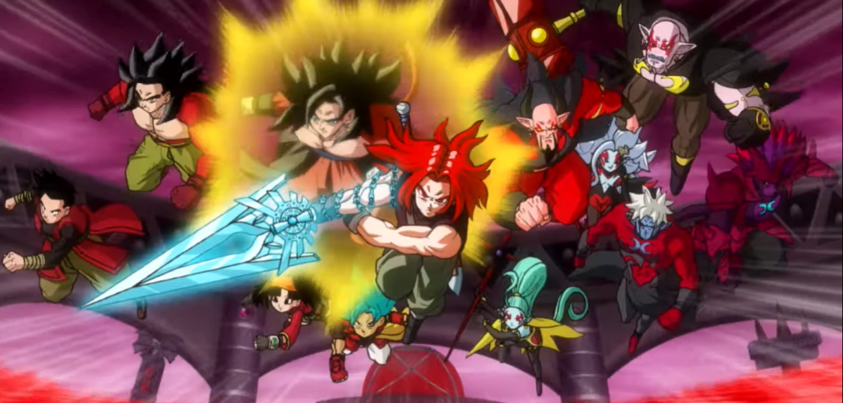 Ultimate Hearts smirks at Super Saiyan Blue Gogeta, Jiren and Hit. Hit tries to attack Hearts through Time-Skip but fails and is knocked down, with Jiren going on to briefly battle the foe before Gogeta powers up and goes on to fight him one on one. In the Demon Realm Mechikabura appears in his Time Power Unleashed form along with Shroom and Salsa in their final forms - who have remained loyal to him. The trio are attacked by the combined might of the Time Patrol - now including Super Saiyan 4 Vegito, and Super Saiyan God Trunks who has a new sword - and the rest of the high-ranked Dark Empire members - who are no longer loyal to Mechikabura.