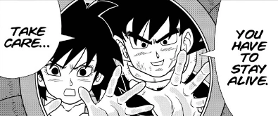 Bardock shoulders the pod with a crying Kakarot as they take it to the launch site. Gine suggests they all run away, but Bardock says it is no use since they would immediately be found with scouters. Gine nervously says to her son that if his father is just overthinking this, they will come for him right away. Bardock warns Kakarot not to look for too long at the full moon; they will tell Raditz about this as well. They tell Kakarot "You absolutely have to stay alive… See you around." Kakarot presses his face against the glass as his pod rises up. Bardock says to watch out for the Galactic Patrol as the pod shoots off the planet. Bardock puts his arm around Gine as Kakarot's pod disappears into the sky.