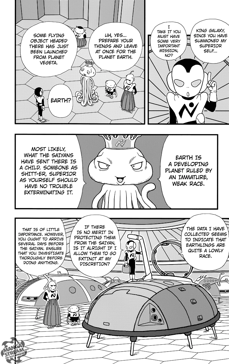 Meanwhile, at Galactic Patrol Headquarters, Jaco inquires why the Galactic King has summoned his exceptional self. It must be for an extremely important mission. The king goes along with this and tells Jaco to go to Earth since a flying object was picked up launching from Planet Vegeta and headed there. Earth is a developing world ruled by humans who are still immature and weak, so the Saiyans have probably sent a child. Therefore, the clumsy Jaco can probably exterminate it himself. After researching Earth, Jaco comments that earthlings are of very poor qualities; if he decides it is not worth protecting them, he will use his Extinction Bomb. His superiors do not mind but tell him to research well before doing it. He should arrive a few days before the Saiyan. Jaco is excited about the prospect of extinction, while one Galactic Patrolman asks whether it was all right to let Jaco handle such a task. The other tells him that Earth is not an important world; the Galactic King gave him the mission figuring they had nothing to lose.