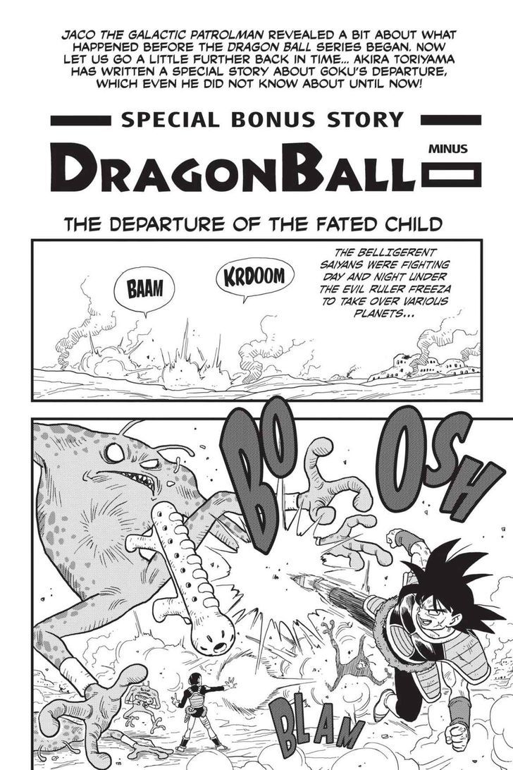 Dragon Ball Minus: Departure of the Fated Child (ドラゴンボール マイナス放たれた運命の子供 Doragon Bōru Mainasu Hanatareta Unmei no Kodomo) is a special manga featured in the collected volume of Jaco the Galactic Patrolman, which was published in Japan on April 4, 2014, and by Viz Media in the 2014 Shonen Jump #18 digital issue released on April 7, 2014. It ties-in with both Dragon Ball and Jaco the Galactic Patrolman.
