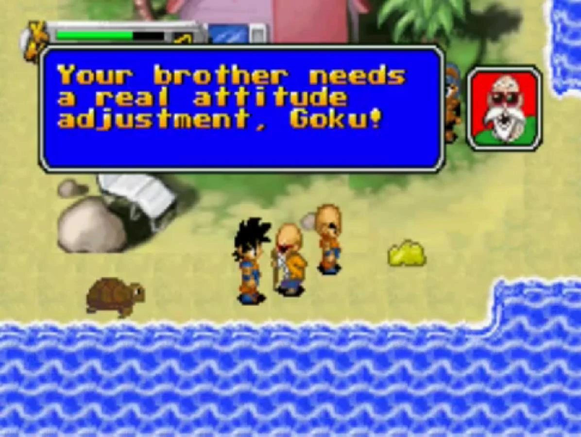 The game starts out at the beginning of the Dragon Ball Z series, when Goku visits his childhood friends Bulma, Krillin, Master Roshi and Turtle at the Kame House with his son, Gohan. Roshi has lost three of his Dirty Magazines on his island, so Goku must retrieve all magazines for him. Immediately after, Raditz arrives on the island and kidnaps Gohan. Goku starts his quest to rescue his son at his house in the woods. There, he meets an old man who somehow got trapped on a little island and is unable to get back; Goku has to collect several stones to make a way for the man to cross the river. He meets Chiaotzu and Tien Shinhan, who give him experience points. He also meets a mother pterodactyl whose egg has been stolen by an enemy pterodactyl. Goku says he understands how she feels and retrieves her egg.
