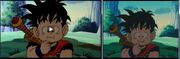 A comparison of the opening scene in Dragon Ball Kai. The shot on the left is the original uncut scene, and the right being the one that appeared on Nicktoons. It is clear to see all traces of blood have been removed from Bardock's face