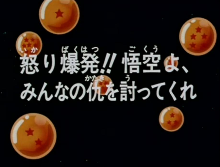 "Explosion of Anger" (怒り爆発!! 悟空よ、みんなの仇を討ってくれ Ikari Bakuhatsu!! Gokū yo, Min'na no Kataki o Utte Kure, lit. "An Explosion of Anger!! Goku, Avenge Everyone's Deaths") is the twenty-second episode of the Frieza Saga and the ninety-sixth overall episode in the uncut Dragon Ball Z series. This episode first aired in Japan on June 26, 1991. Its original American airdate was October 19, 1999. It features Goku's first fight as a Super Saiyan after becoming enraged at Krillin's death.