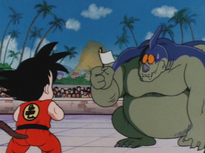 During the Quarter Final Match, the fight begins with hand-to-hand combat, Goku throws Giran from the ring, however being that he has wings he is able to return to the ring without going out of bounds. Giran uses his Merry-Go-Round Gum to bind Goku then punches him and attempts to throw him out of bounds. Goku is able to use his Flying Nimbus to avoid a ring out, the referee rules in his favor for a first-time offense but warned him that he will be disqualified if he does it again. Goku is then saved by the appearance of his regrown tail that grabs onto Giran's arm at the moment of impact. Goku manages to break free of the gum thanks to his new-found strength, then tests it out on one of the arena walls, destroying it outright. Seeing this terrifying feat, Giran raises a white flag, conceding to Goku.