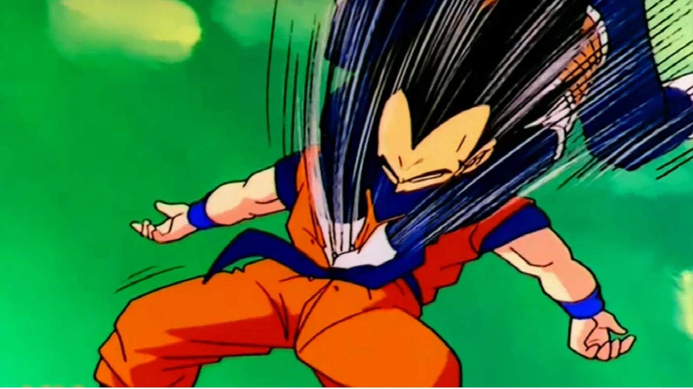 Vegeta performing the Double Axe Handle portion of Wild Hunt on Ginyu in Goku's body