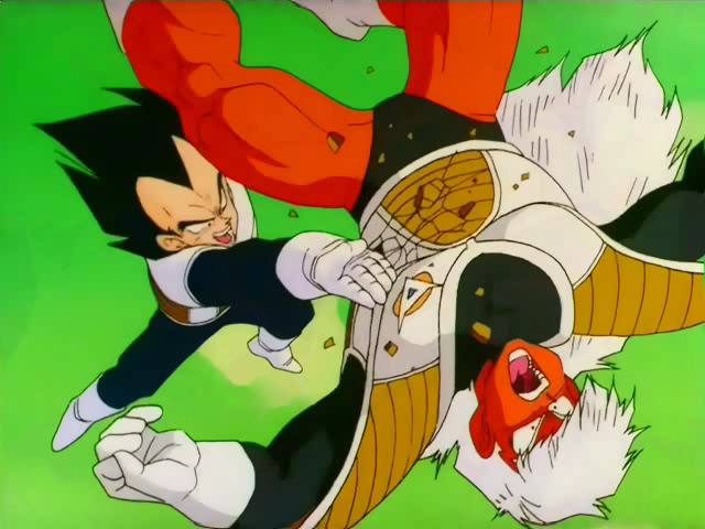 As the fight rages on, Ginyu begins to get the hang of Goku's body, and turns the tables on Krillin and Gohan. Goku briefly gets the hang of Ginyu's body and joins the battle but is easily brushed aside. Meanwhile, Vegeta stuns Jeice with his new power and brutally dispatches him, claiming to be a Super Saiyan. Ginyu denies it, and Vegeta turns his sights on him, pummeling him into submission with a few hard blows and sending him crashing to the ground, injuring him severely. Vegeta flies downward to finish Ginyu, but Ginyu smirks and begins his body-switching technique again with Vegeta fast approaching.