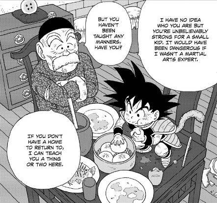 Days later after being sent to Earth, Kakarot lands in Mount Paozu. While there, he is found by an elderly man, Gohan. He takes him in and feeds the newly found alien. Kakarot is eating when he is given the name "Son Goku". While Kakarot seems somewhat placated by the food, Grandpa Gohan notes his lack of manners as he stands upon the table to eat rather than sit in the nearby empty chair. It is also implied by Grandpa Gohan's statements that the two briefly fought when they first met, though Grandpa Gohan was apparently able to prevail, due to him being a more experienced martial artist than the young low class Saiyan.