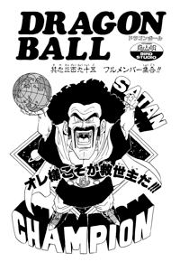 The covers shows Mr. Satan as the "champion of the Earth" as he holds a globe, with the galaxy behind him.