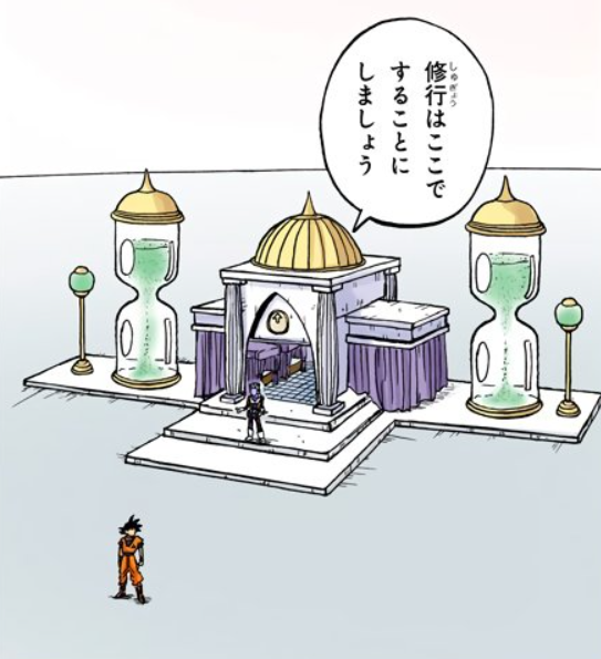During Goku and Vegeta's training in preparation to resume their battle against Moro after having no success to defeating him on New Namek, Goku goes with Merus on another planet to learn how to use Ultra Instinct in hopes of using it as an advantage against Moro to defeat him once their battle resumes while Vegeta is with Irico on Yardrat for Vegeta to learn Spirit Control to use the technique against Moro as well and become stronger. During their training, Merus reveals he knows Ultra Instinct and brings Goku to a room inside a pyramid resembling the hyperbolic time chamber in which 1 day that passes outside of the room is equivalent to 3 days in the room. Because it takes 4 real months outside the room to complete 1 year of training inside of it, he says the main reason for heading inside the room is so that he can unleash his full power without anyone finding out while they continue their training. Now serious, Merus asks Goku if he is ready to continue their training and Goku happily obliges to continue the training.