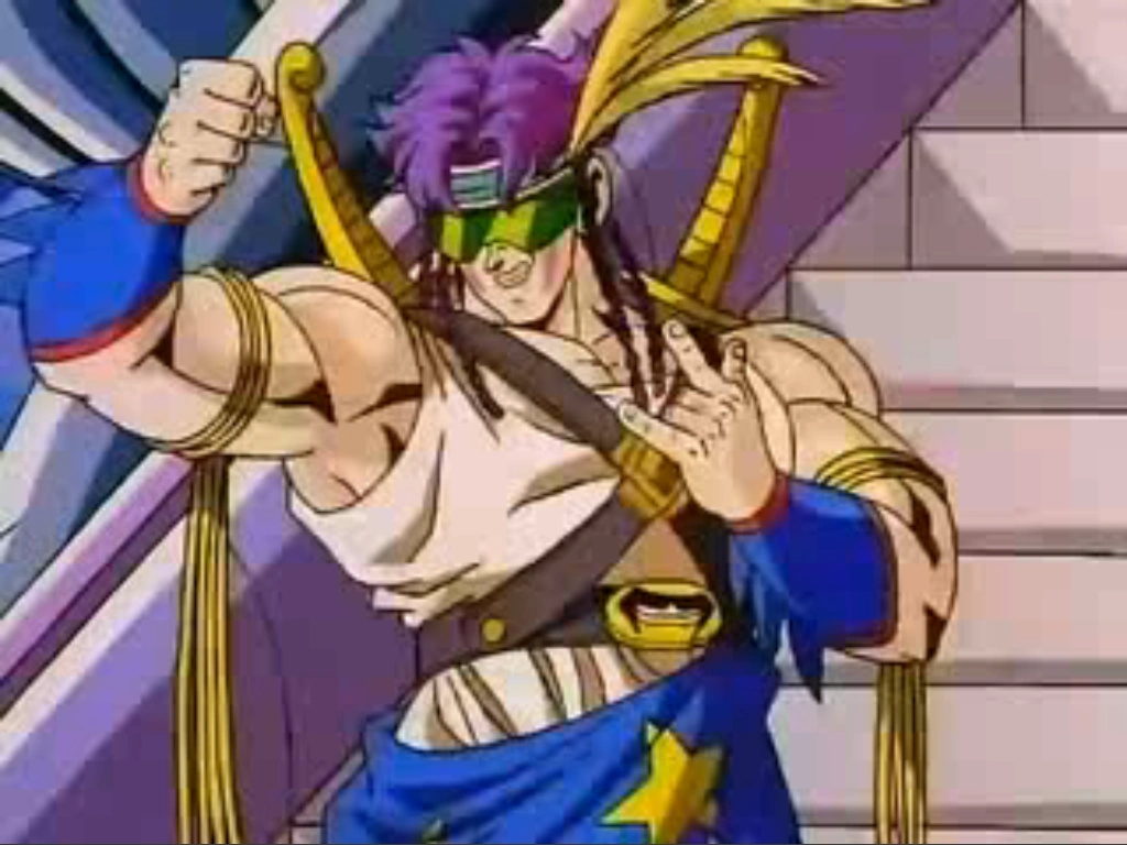Fighter 1 is a tall muscular man with light skin and purple hair. He wears a white tank top, blue boots and spikes cuffs on his forearms, green visor shades. He also has two swords on his back connected to his belt.