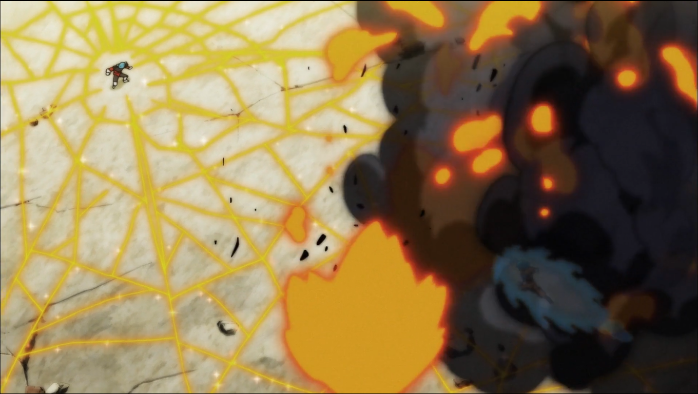 When Dyspo was being overwhelmed by Hit, K'nsi was ordered by Top to jump in and help him. He used his energy threads to save his comrade as he was about to fall off the tournament edge. Not wanting Dyspo to be defeated, K'nsi prepared to help him fight Hit. Hit managed to hold his own against Dyspo's speed, but he was captured by K'nsi's threads and attacked by Dyspo. When Goku appeared in his Super Saiyan God to help out Hit, Dyspo speed-blitzed Goku and knocked him back, but before Hit can attack him right after, he was caught by K'nsi. To counter Hit's Time-Skip, K'nsi surrounded himself with his threads, saying that if Hit touches them, they'll explode, thus preventing Hit from getting close to him. Hit says he doesn't intend to get close, using his Flash Fist Crush to attack Kunshi from a distance.