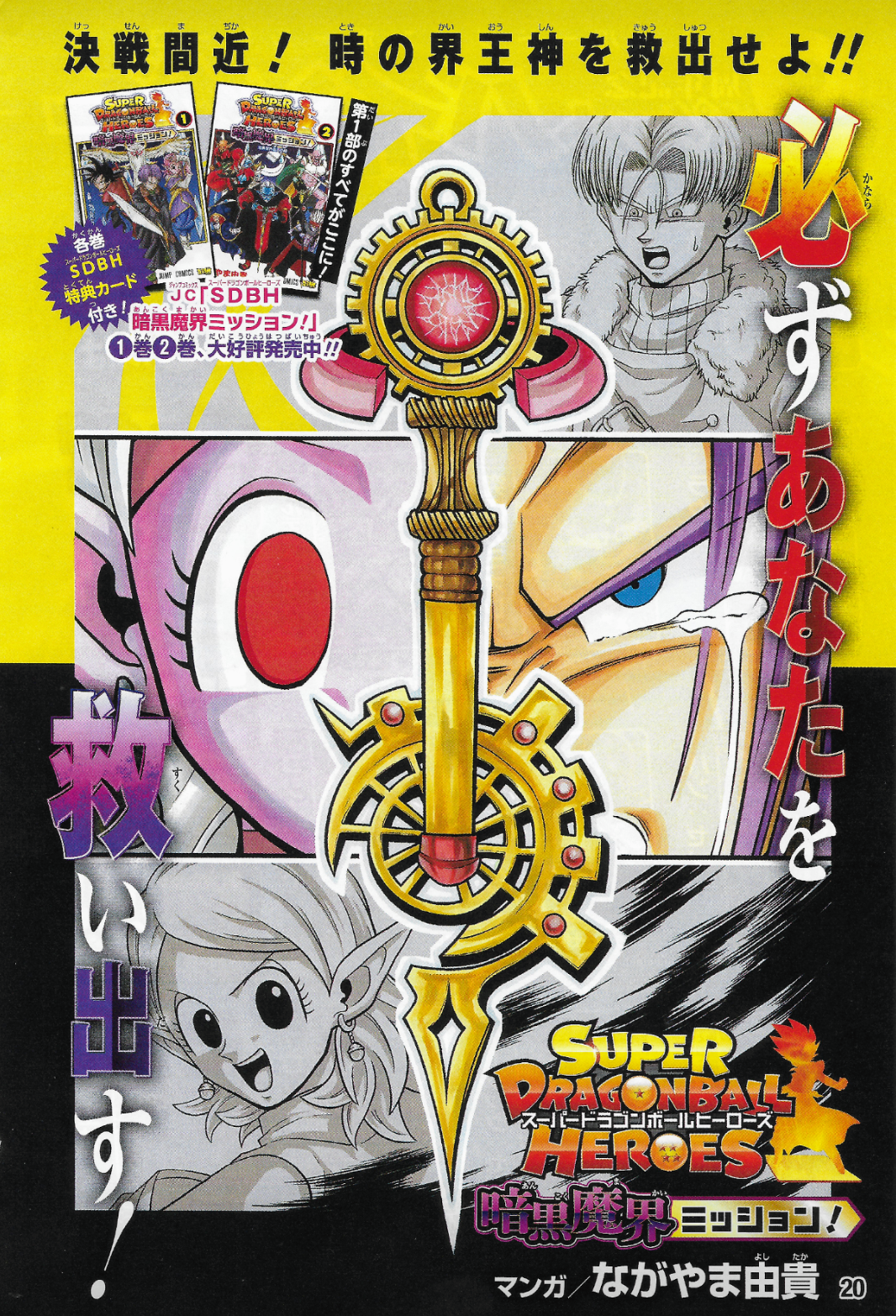 Furious, Xeno Trunks transforms into a Super Saiyan 3 and charges at Chronoa. Striking her with the Key Sword, he purifies the darkness within her and returns her to normal along with unfreezing the rest in the hideout. Robelu tells everyone that the next step of their plan has now been achieved as well and now all they must do is wait for Demigra to restore the Dragon Balls. Just then a mass of dark energy comes crashing down upon everyone as Mechikabura emerges a top a nearby tower.