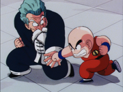 In his semi-final match, Krillin is matched against Jackie Chun, who is Master Roshi in disguise. Krillin is able to put up a respectable fight against his master, using his strength and cunning, at one point knocking Jackie Chun out of the ring by using panties as bait. Using a Kamehameha, Jackie Chun propels himself back into the ring. Krillin charges at Jackie Chun, but Jackie Chun dodges the attack so quickly that he leaves an after image. Krillin unknowingly attacked the after image. Jackie Chun appears behind Krillin, who is quite bewildered, and lands a heavy blow on the young fighter's back for the win.